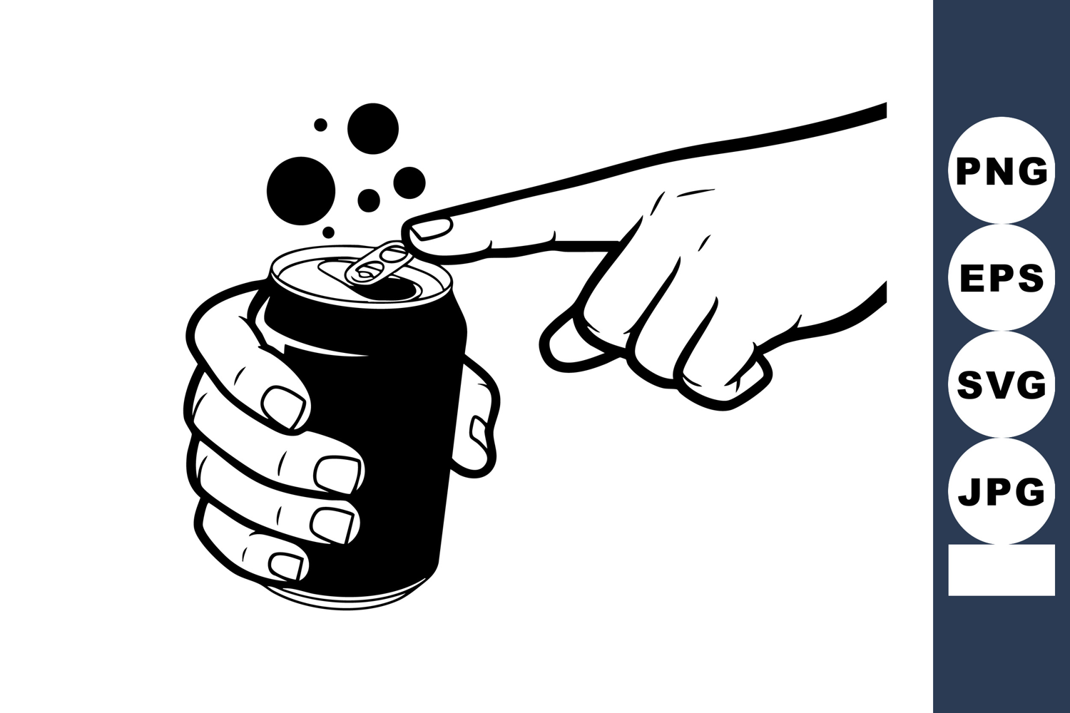 This vector illustration shows a hand holding a soda can while the index finger presses the tab to open it. The image is black and white with clean line art. Crisp and clear mood.