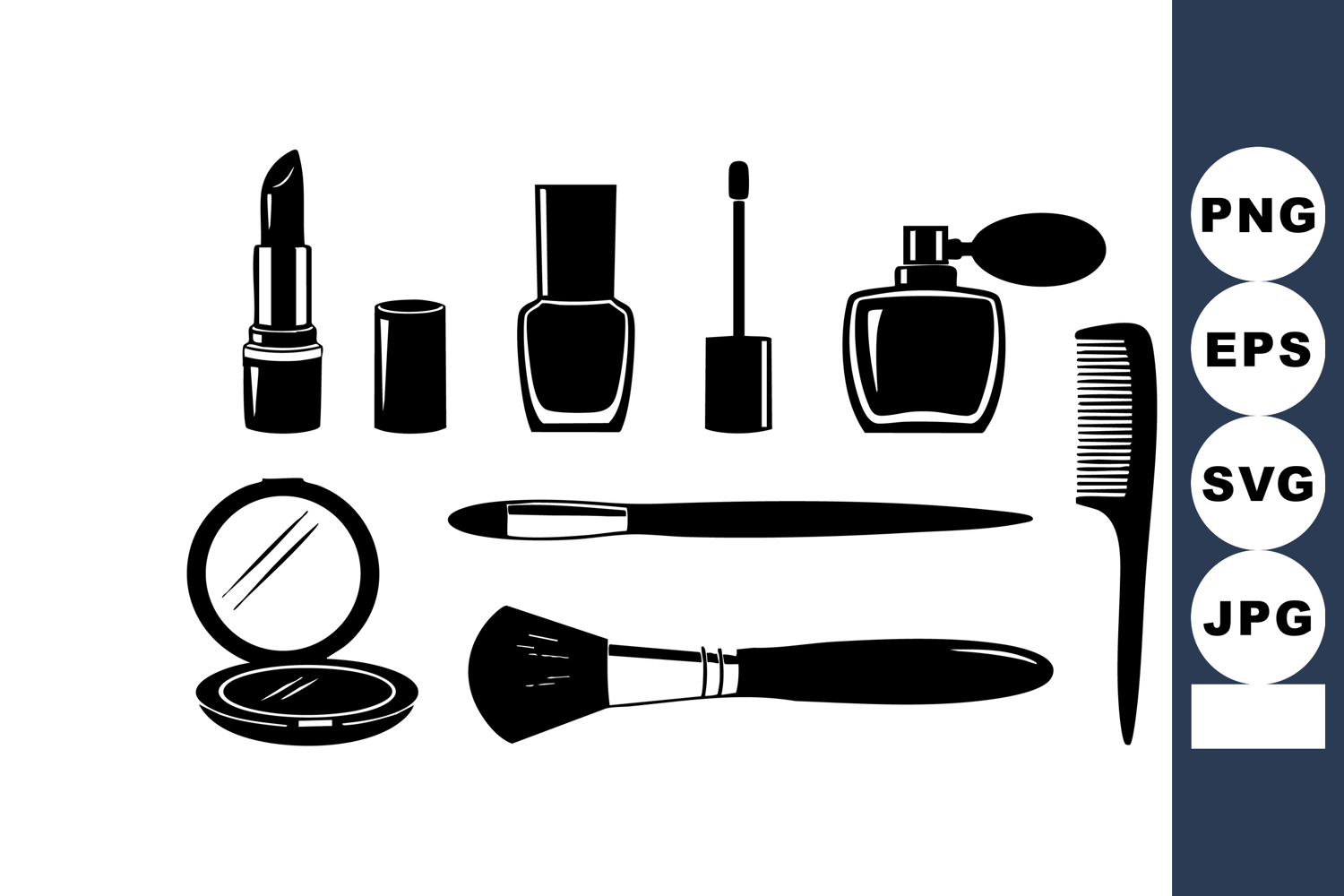 This vector illustration shows black silhouette makeup items including lipstick nail polish brush comb and perfume bottle arranged neatly on a white background creating a clean artistic mood.