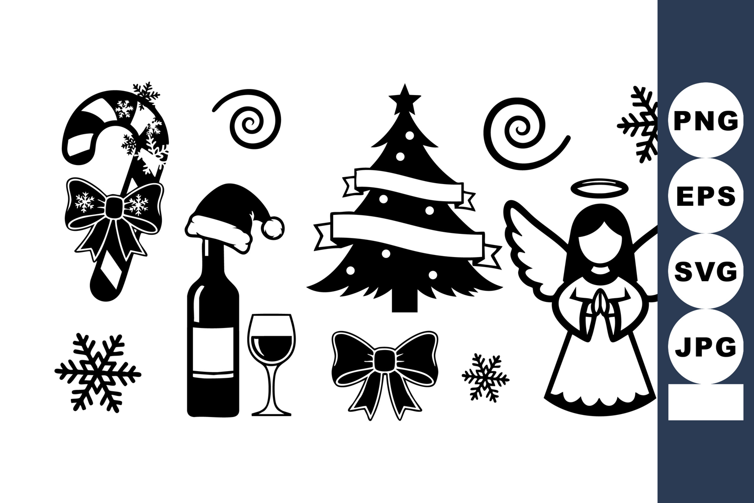 This vector illustration shows black Christmas holiday icons including a candy cane, wine bottle, glass, decorated tree, angel, bows, and snowflakes in a festive style. Cheerful mood.