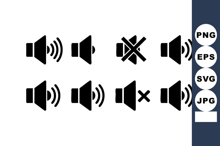 This vector illustration displays a set of black speaker icons representing volume on mute and unmute states with sound waves and cross marks. Minimalist design and clear symbols create a modern and functional mood.