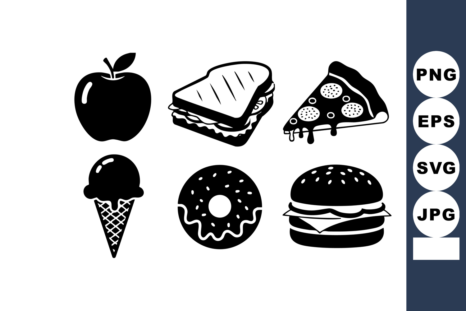 This vector image shows black silhouette icons of common foods including apple sandwich pizza ice cream donut and burger in a simple style with clear shapes and contrast cheerful