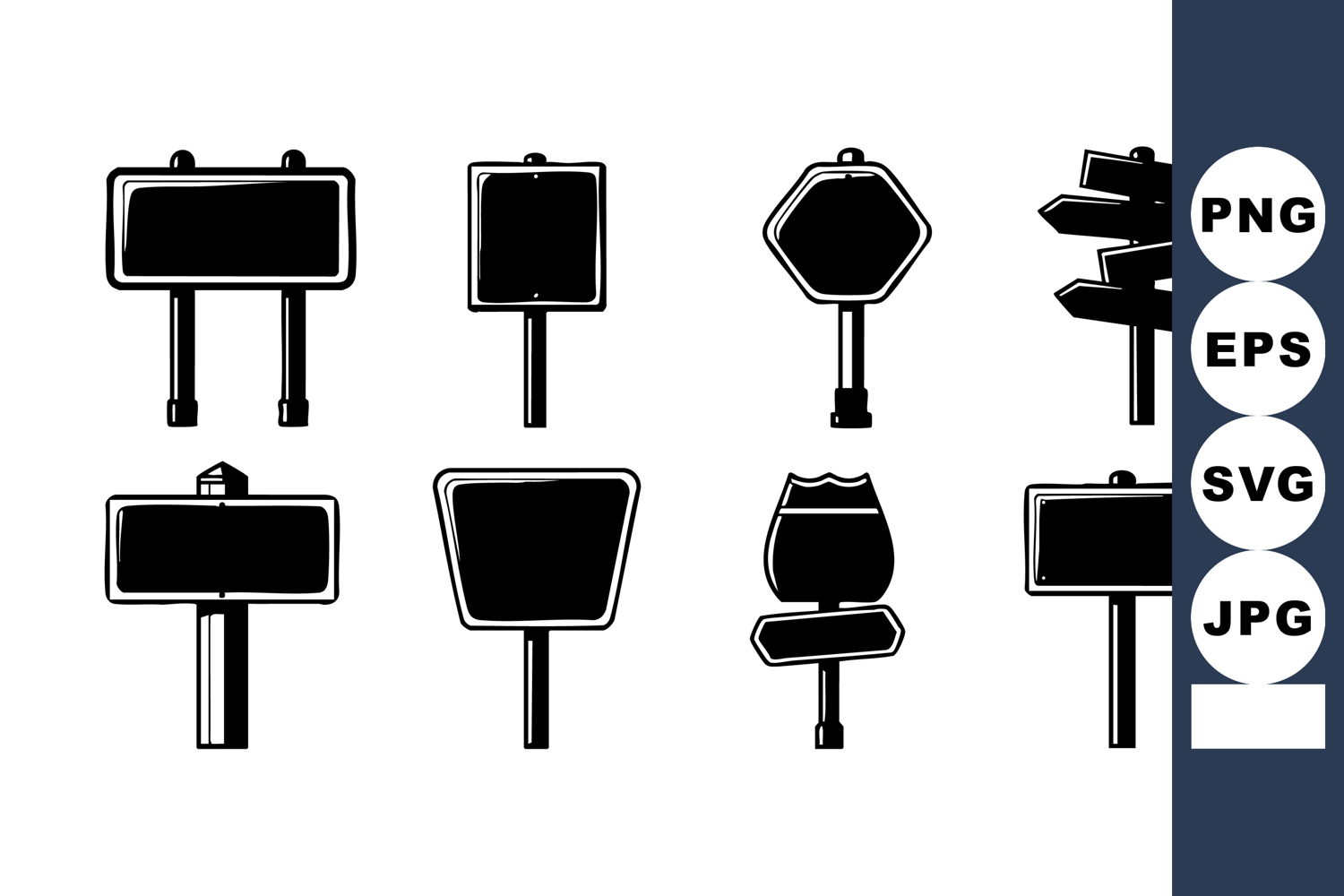 The image shows a collection of blank street signs in various shapes and orientations. The signs are black silhouettes with white outlines on a white background. The style is simple and bold. The mood is neutral.
