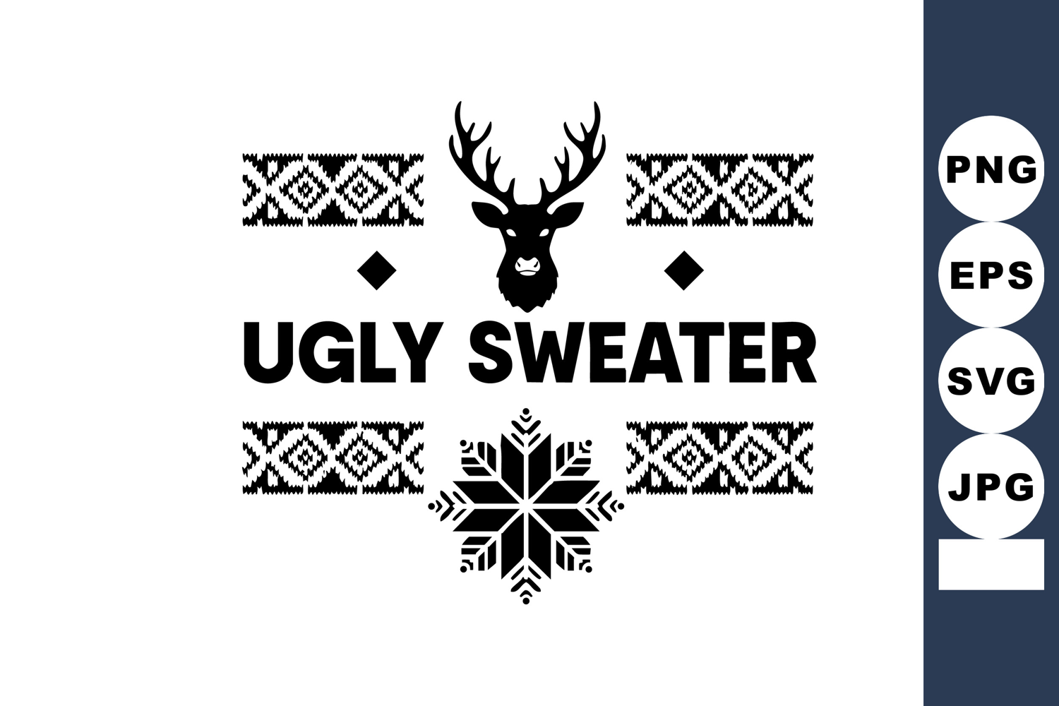 This vector illustration features a black and white ugly sweater design with a reindeer head and a snowflake surrounded by geometric patterns representing winter and holiday spirit in a minimalist style calm