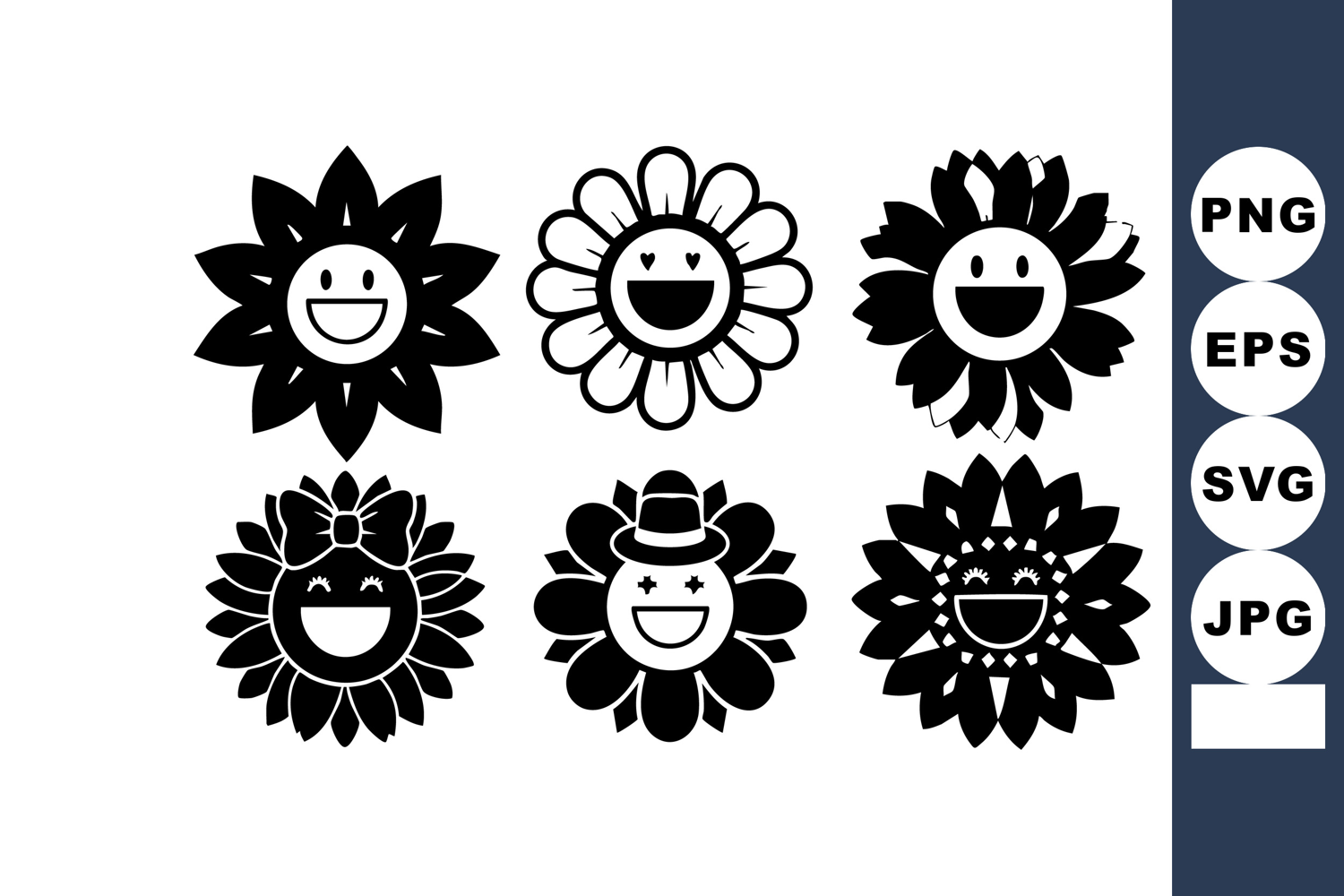 This vector illustration features six smiling sunflowers in black and white with happy faces expressing joy and cheerfulness in a simple and playful style mood uplifting