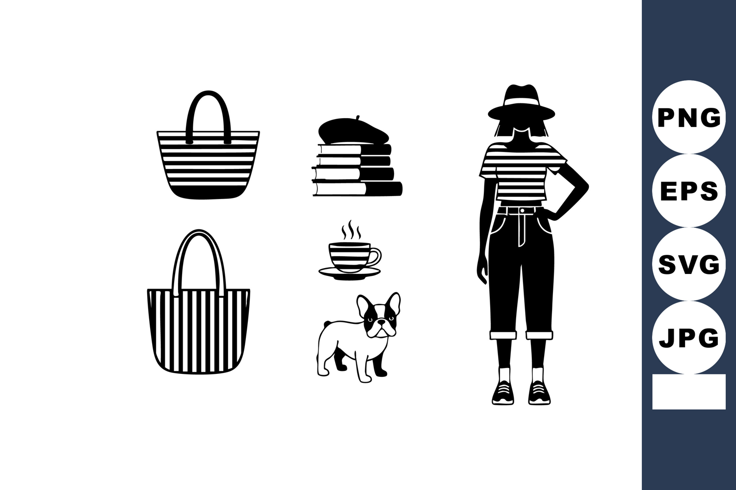 Woman Coffee Cup Black White Silhouette Fashionable Woman Striped Woman Wearing Hat Striped Bags Books Small Dog Standing Stylish Modern Outfit Casualwear With Accessories Woman Holding Bags Summer Fashion Trend