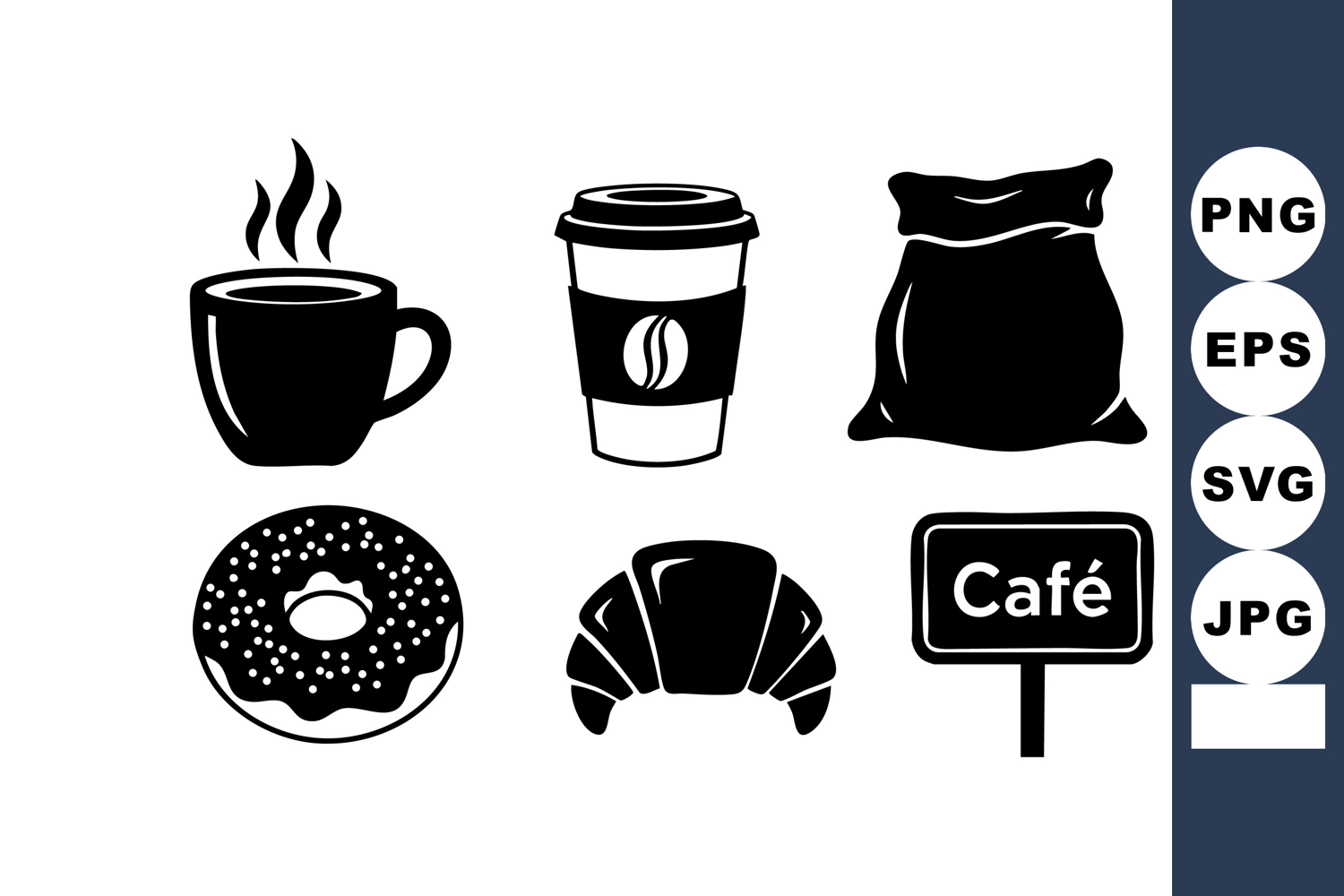 This vector illustration shows simple black icons of a steaming coffee cup coffee to go cup coffee bag donut croissant and a cafe sign in clear style calm