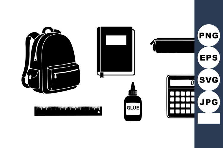 Flat Style Design Black Silhouette Vector School Supplies Backpack Notebook Glue Ruler Calculator Pencil Case Educational Tools Vector Simple School Supplies Minimal School Icons Student Study Tools Learning Vector Illustration