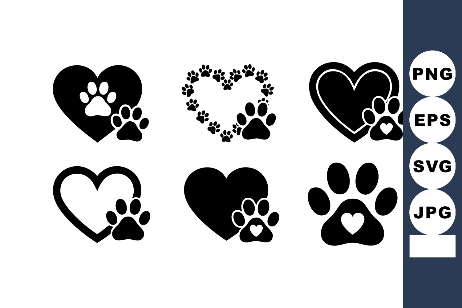 This vector file shows six black paw print heart icons representing love and affection for pets. The simple shapes convey warmth and care in a minimalist style. Charming mood.