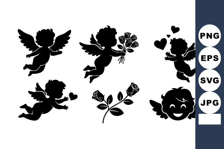 Black silhouette cherubs with wings display love hearts and a rose bouquet in flying poses. Includes smiling face and single rose elements. Romantic and playful mood.