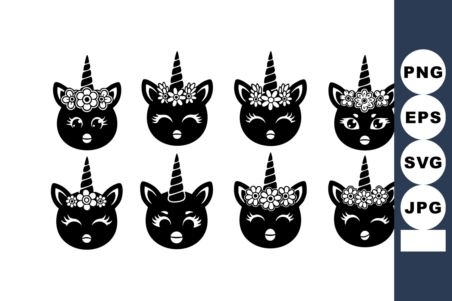 This vector illustration shows eight black unicorn cat faces with floral crowns and different expressions on a white background in a cute style. Playful and charming mood.