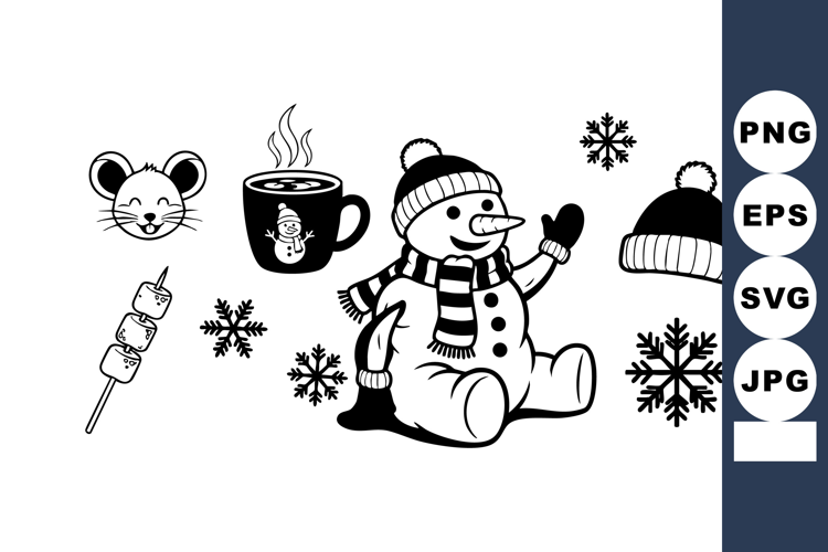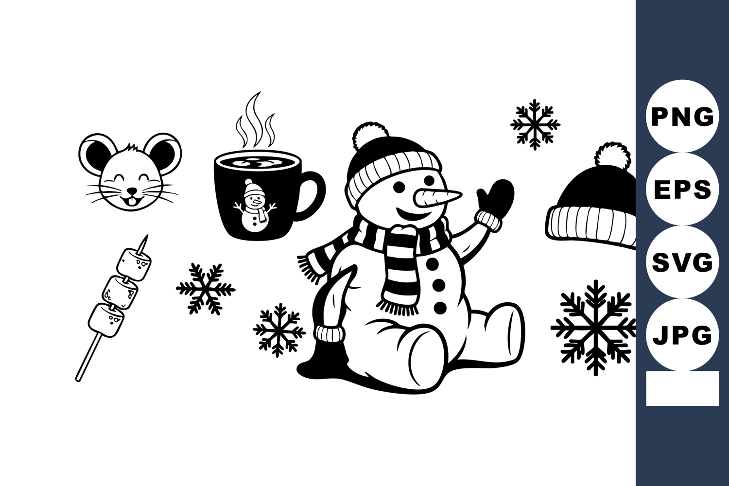 Snowman Winter Hat Winter Hat Scarf Hat Scarf Mittens Scarf Mittens Hot Mittens Hot Chocolate Hot Chocolate Marshmallows Marshmallows Snowflakes Vector Snowflakes Vector Illustration Cheerful Snowman Wearing Steaming Cup Hot