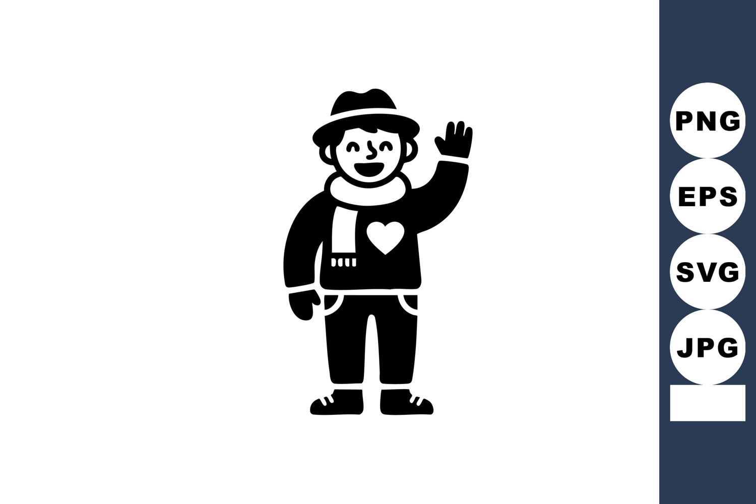 This vector illustration shows a smiling person dressed in winter clothes with a hat and scarf waving hand. The heart symbol on the sweater adds warmth and friendliness. Cheerful mood.