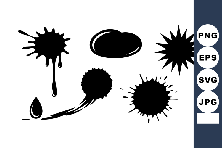 This vector image shows five different black paint splatters and ink drops with varied shapes and sizes used for creative and artistic purposes in design work. Simple and dynamic mood.