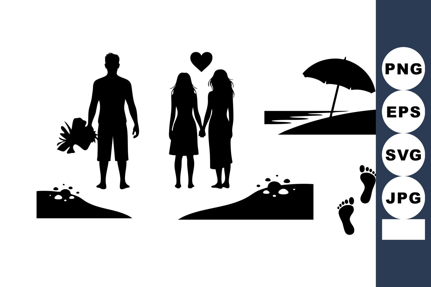 This vector illustration shows a silhouette family with a man holding flowers, two women holding hands, a beach umbrella, and footprints on sand, creating a peaceful outdoor scene mood.
