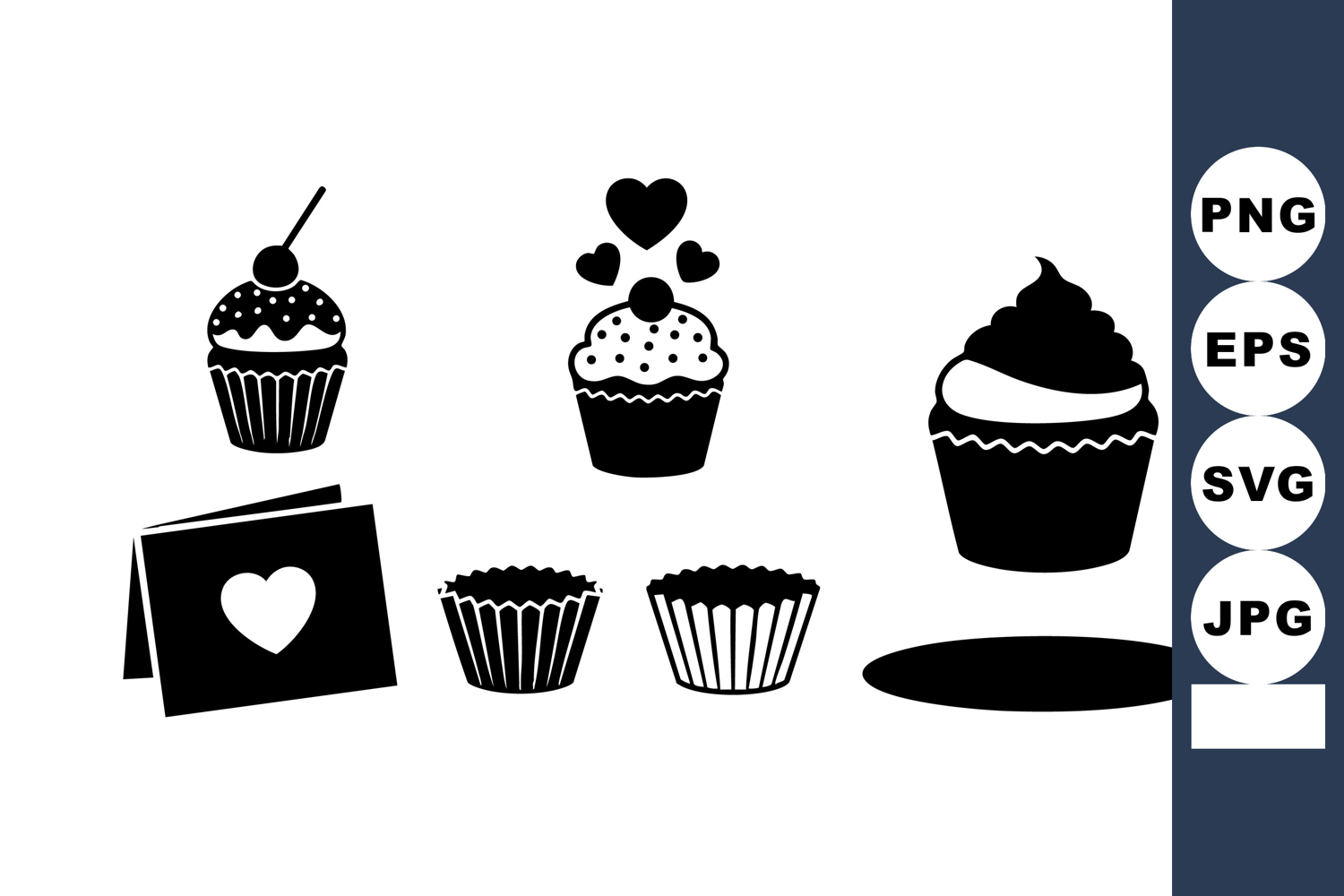 This vector illustration shows cupcakes decorated with hearts and a greeting card with a heart symbol. The design is simple and charming, conveying affection and sweetness. Romantic mood.