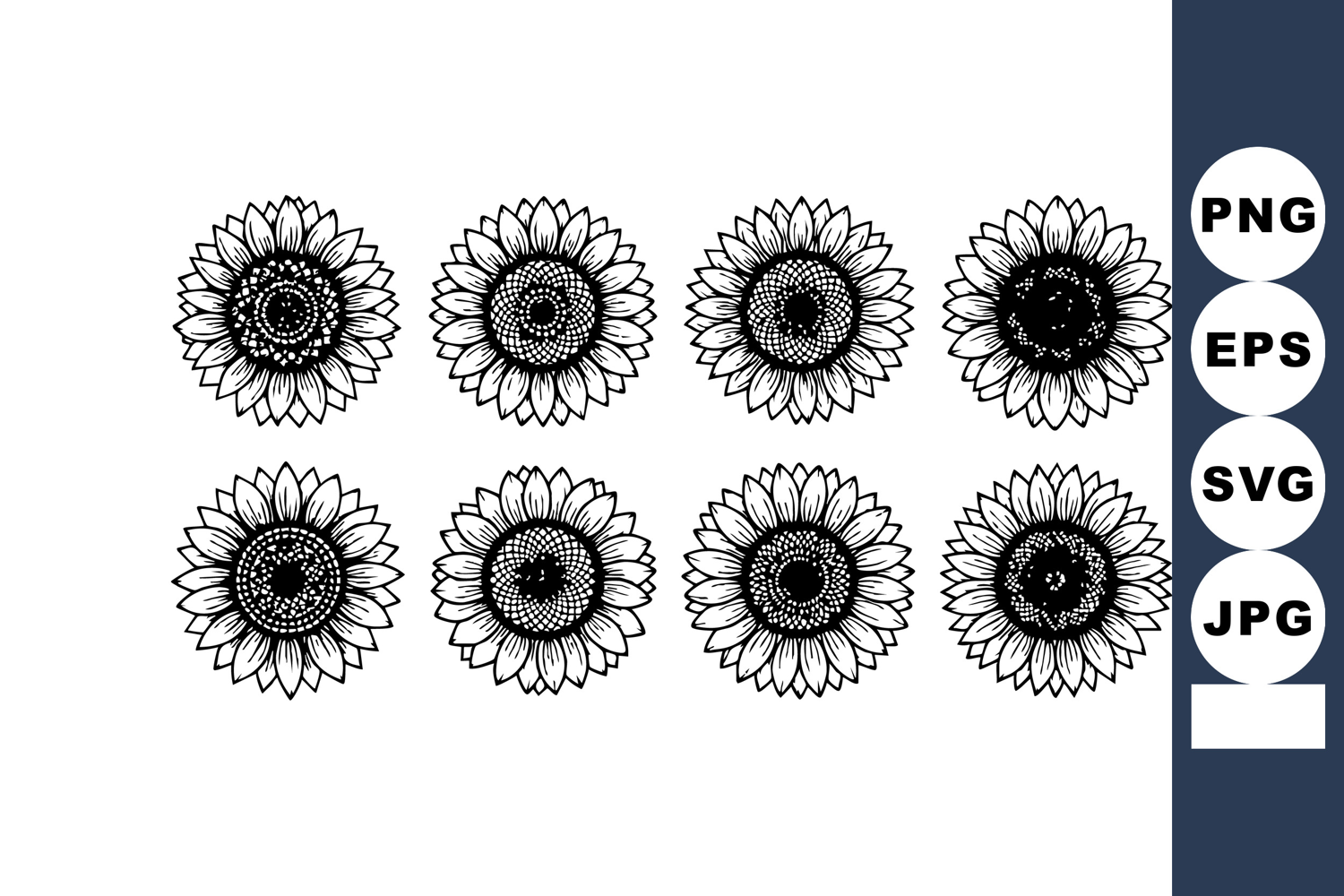 This vector features ten black and white sunflower illustrations with different shading styles and petal arrangements in a simple line art design suitable for floral decoration and creative projects. Calm and elegant.