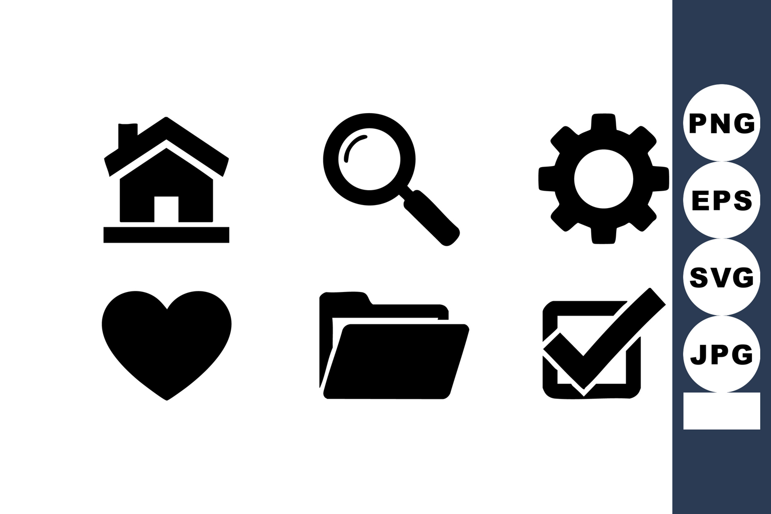 This vector file presents a clean set of six black icons including home, heart, folder, checkmark, search, and gear symbols in a minimalist style. Functional and clear design. Modern.
