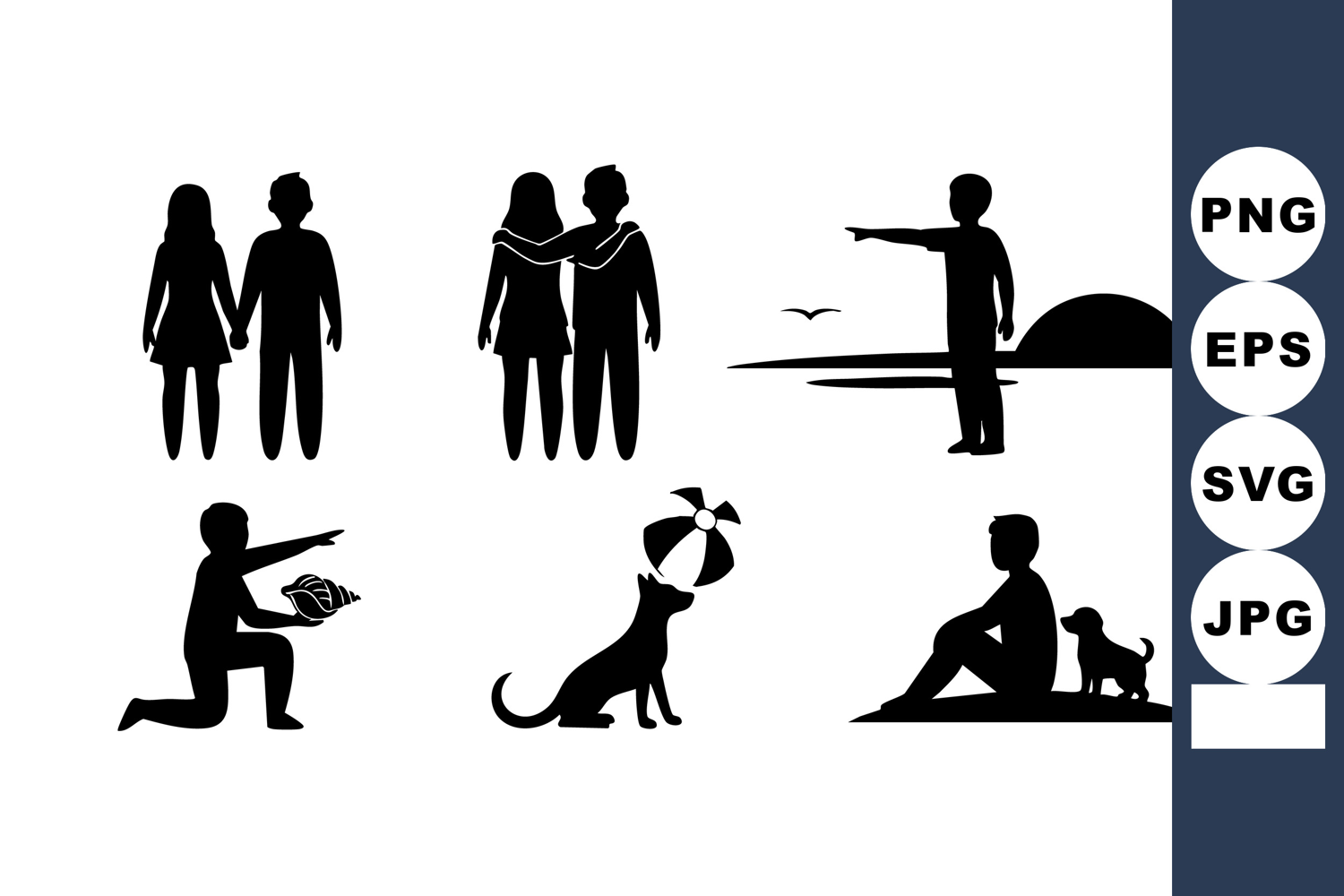 This vector illustration shows black silhouettes of people and a dog at the beach during sunset. The figures display casual and playful interactions in an outdoor setting. Relaxed mood.