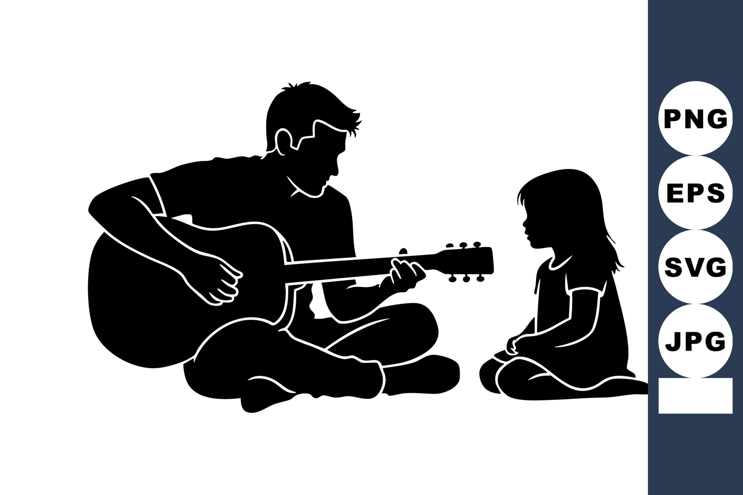 Silhouette of a father playing guitar while daughter sits on floor watching attentively in a black and white vector illustration with a calm and warm mood.