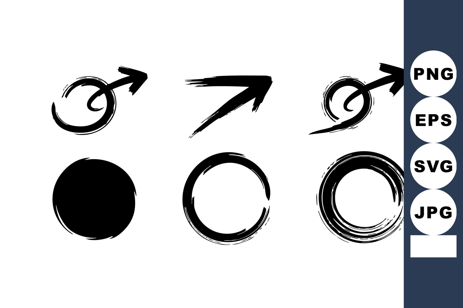 This vector illustration features various male gender symbols including solid black circle and brush stroke ring styles in black color on white background. Clean and modern design.