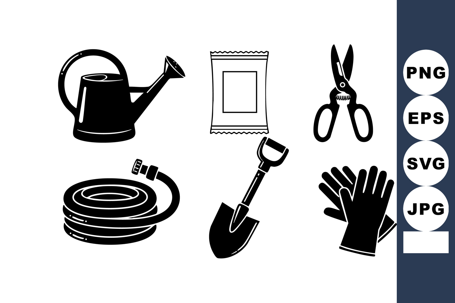 Black White Vector Garden Tools Watering Watering Can Hose Hose Gloves Shovel Gloves Shovel Scissors Shovel Scissors Seed Seed Packet Black Vector Illustration Gardening Gardening Equipment Outdoor Outdoor Work Plant
