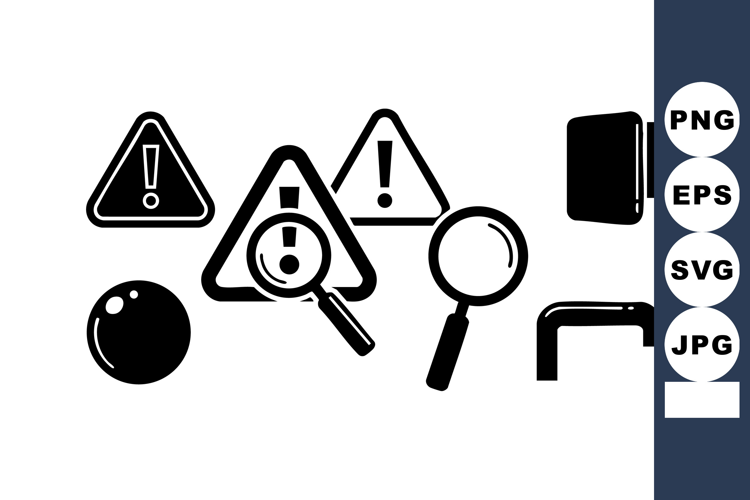 This vector file shows various warning sign icons combined with magnifying glass and alert symbols in black and white style. The design is clear and minimalistic with sharp edges. Alerting mood.