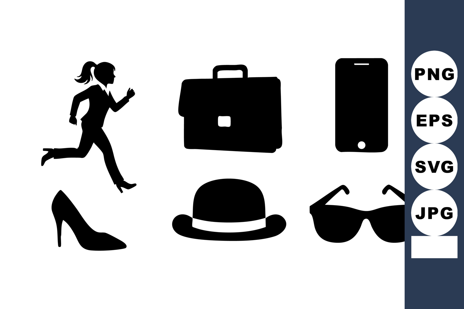 Black silhouette icons of a woman running high heel shoe briefcase hat sunglasses and smartphone on white background in minimalist style energetic mood