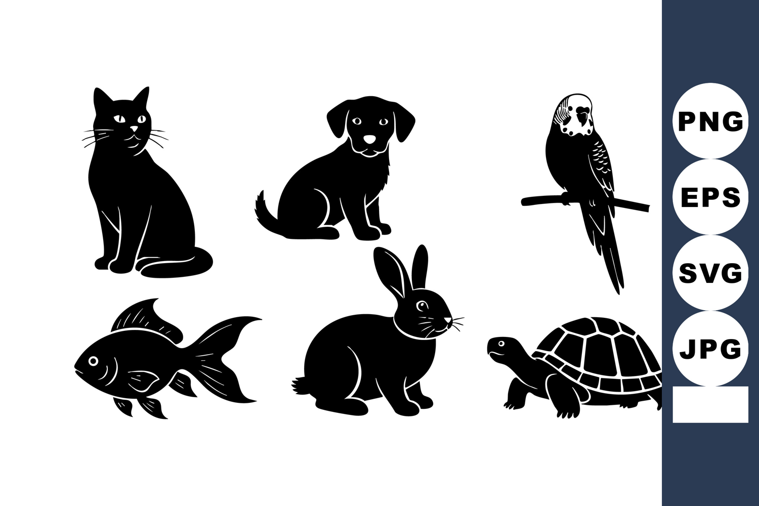 This vector illustration features black silhouette icons of a cat dog parrot fish rabbit and turtle arranged in a simple style with clear shapes and solid black color calm mood