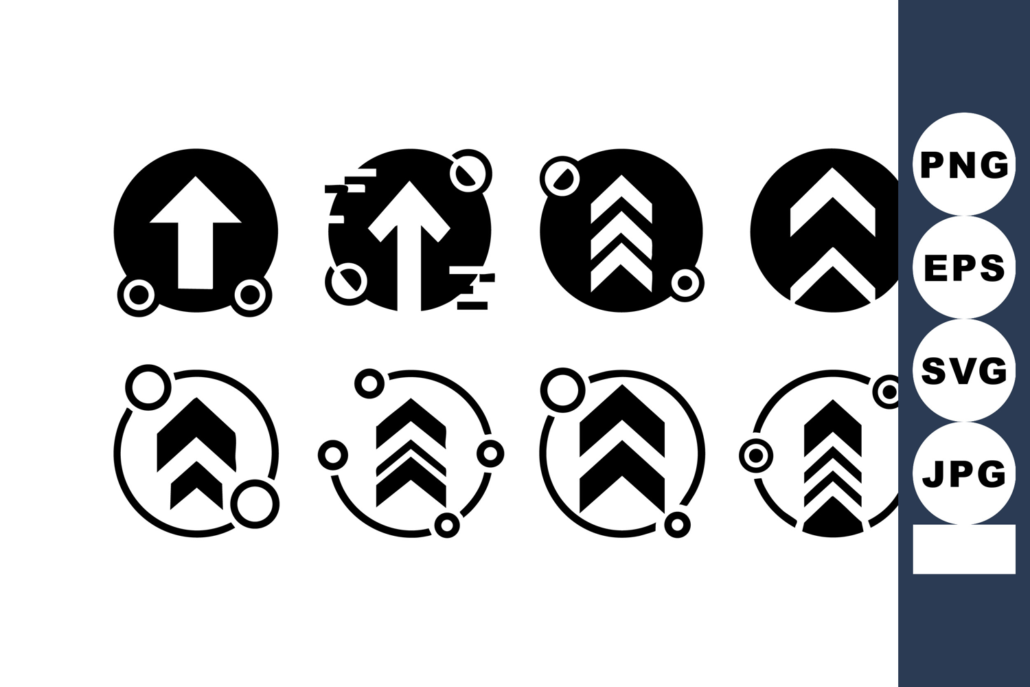 This vector file presents a collection of upward arrow icons in black and white with clean lines and circular accents suitable for user interface or navigation designs calm