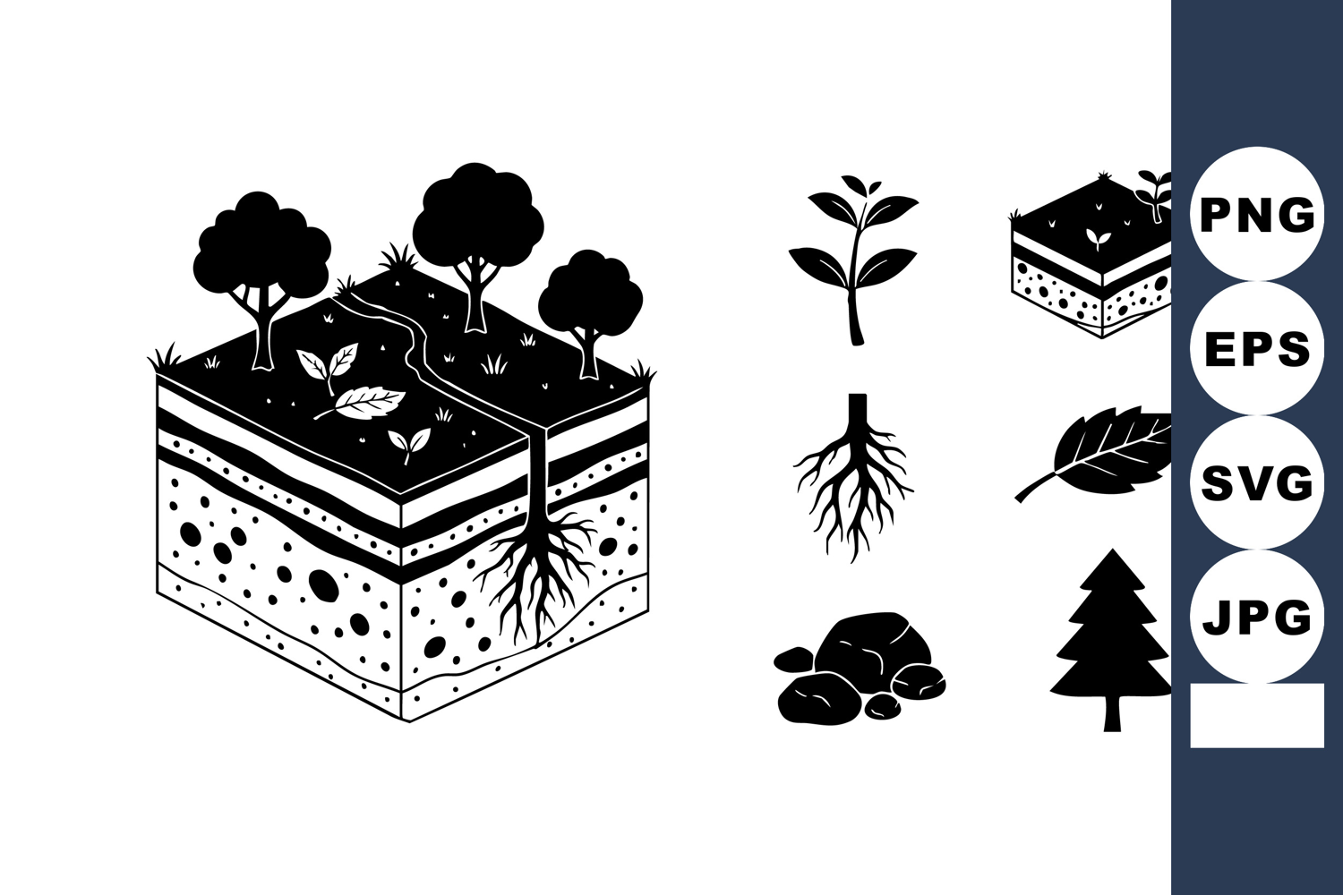 Black and white vector illustration showing soil layers with trees roots plant leaf pine tree and rocks ideal for environmental and nature education clear simple style calm