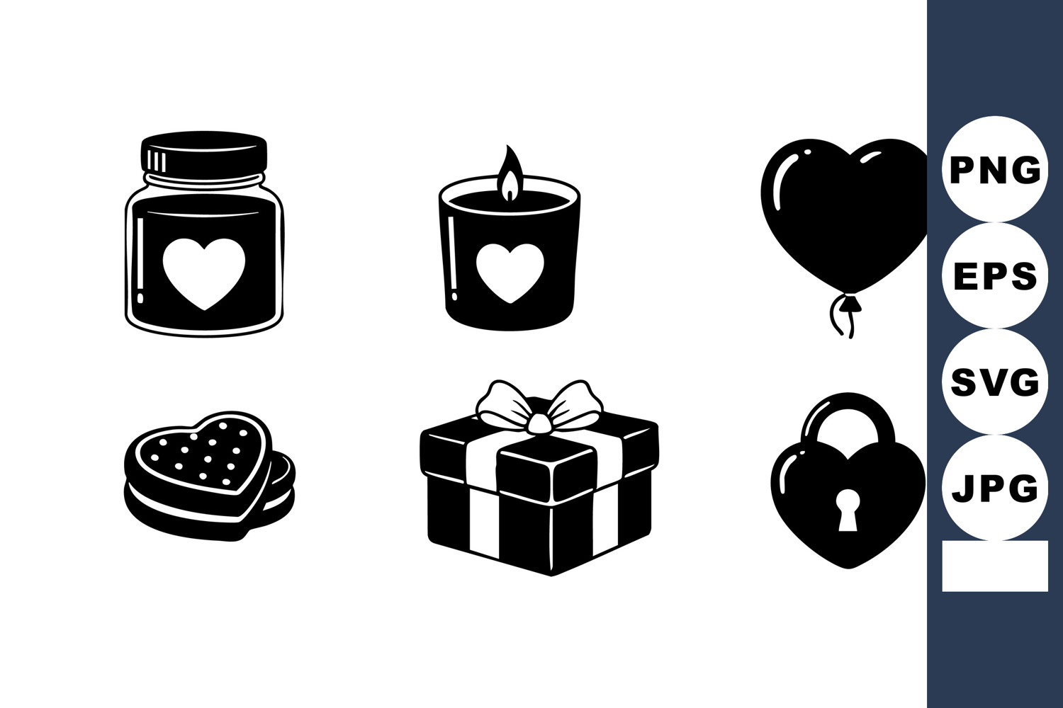 This vector illustration displays six black and white Valentine symbols including a jar, candle, balloon, heart cookie, gift box, and heart lock with a romantic mood.