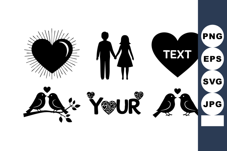 Vector illustration features romantic heart shapes, loving couple silhouettes, birds on branches, and decorative text elements conveying love and affection in a simple black style. Romantic mood.