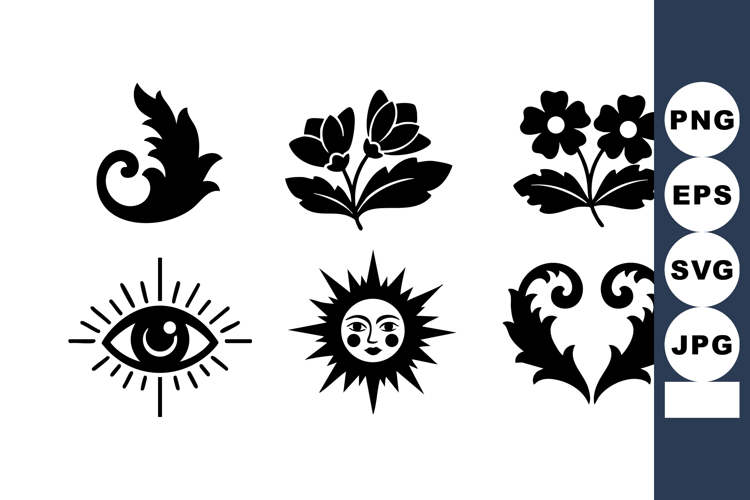 This vector illustration features vintage floral decorative elements including leaves, flowers, a sun with a face, and an eye design in black and white with simple ornamental shapes. classic style elegant