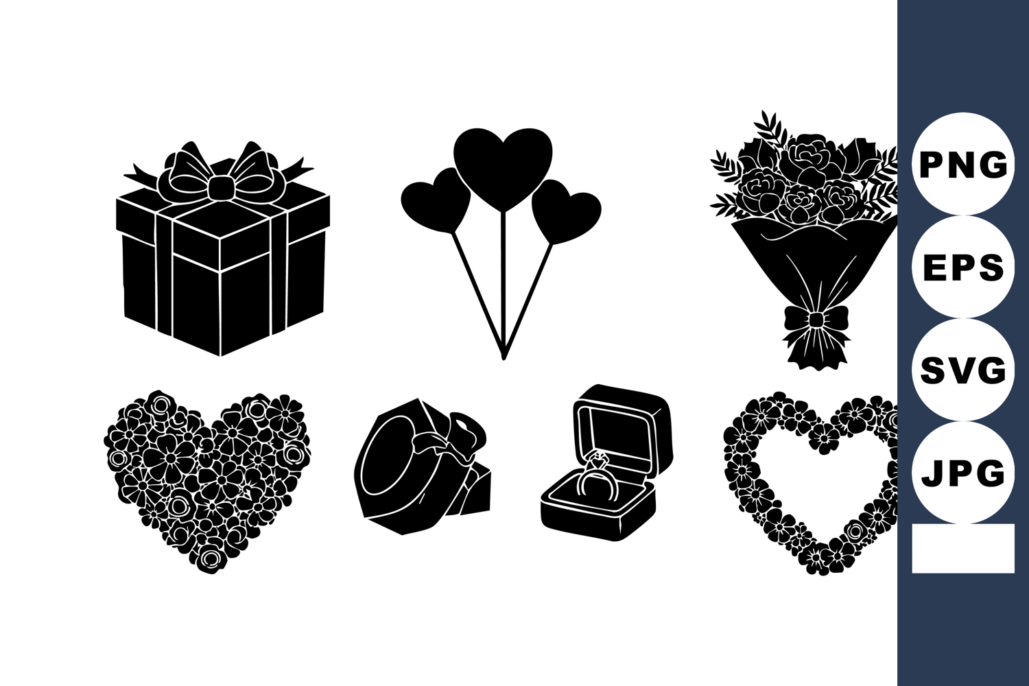 This vector illustration shows a collection of Valentine themed symbols including a gift box, heart shaped balloons, flower bouquet, heart wreath, ring with box, and heart made of flowers, conveying love and romance in a simple black silhouette style. Charming and romantic.