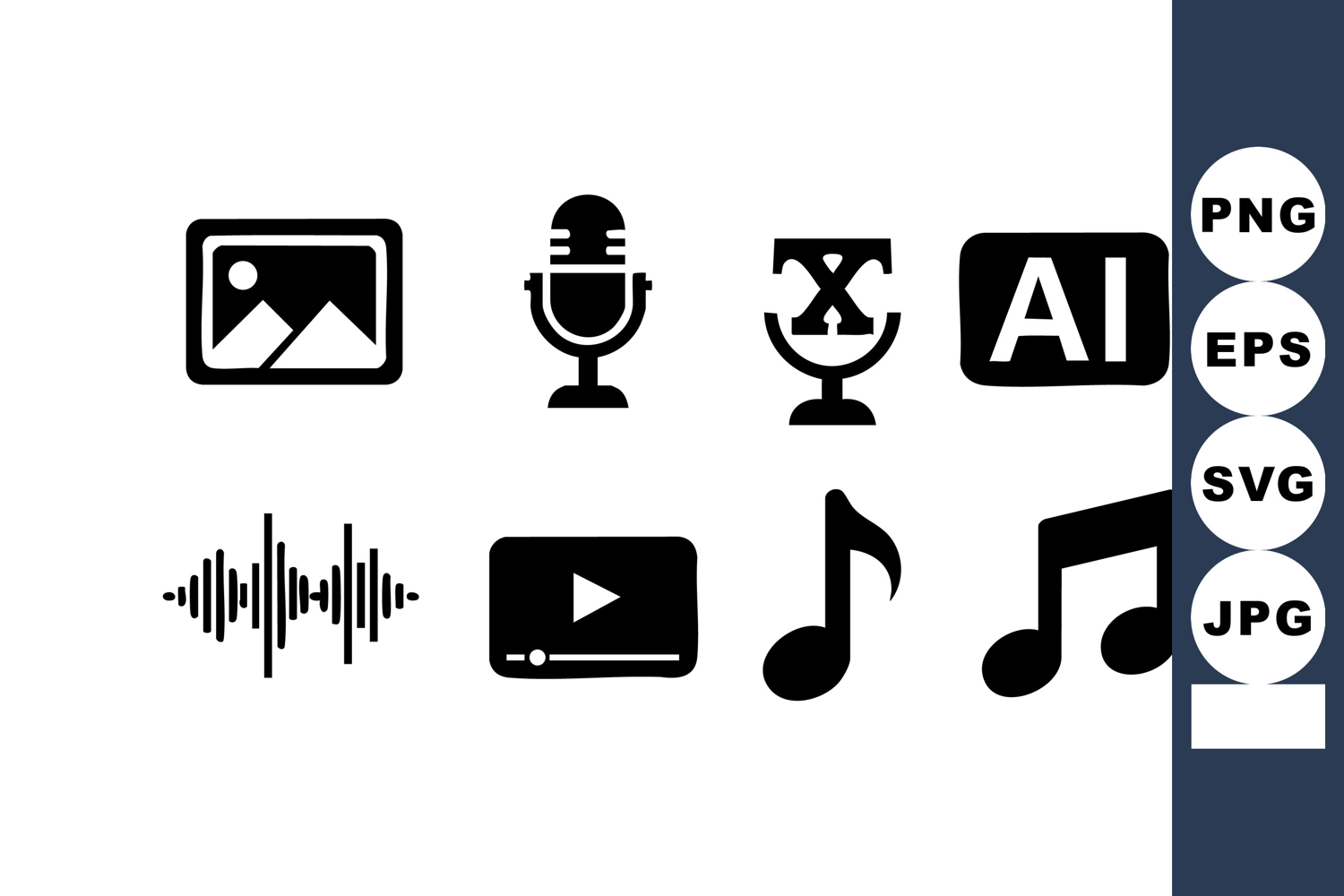 This vector file contains simple black multimedia icons such as photo, microphone, trophy, artificial intelligence, sound wave, video player, and music notes presented on white background calm.