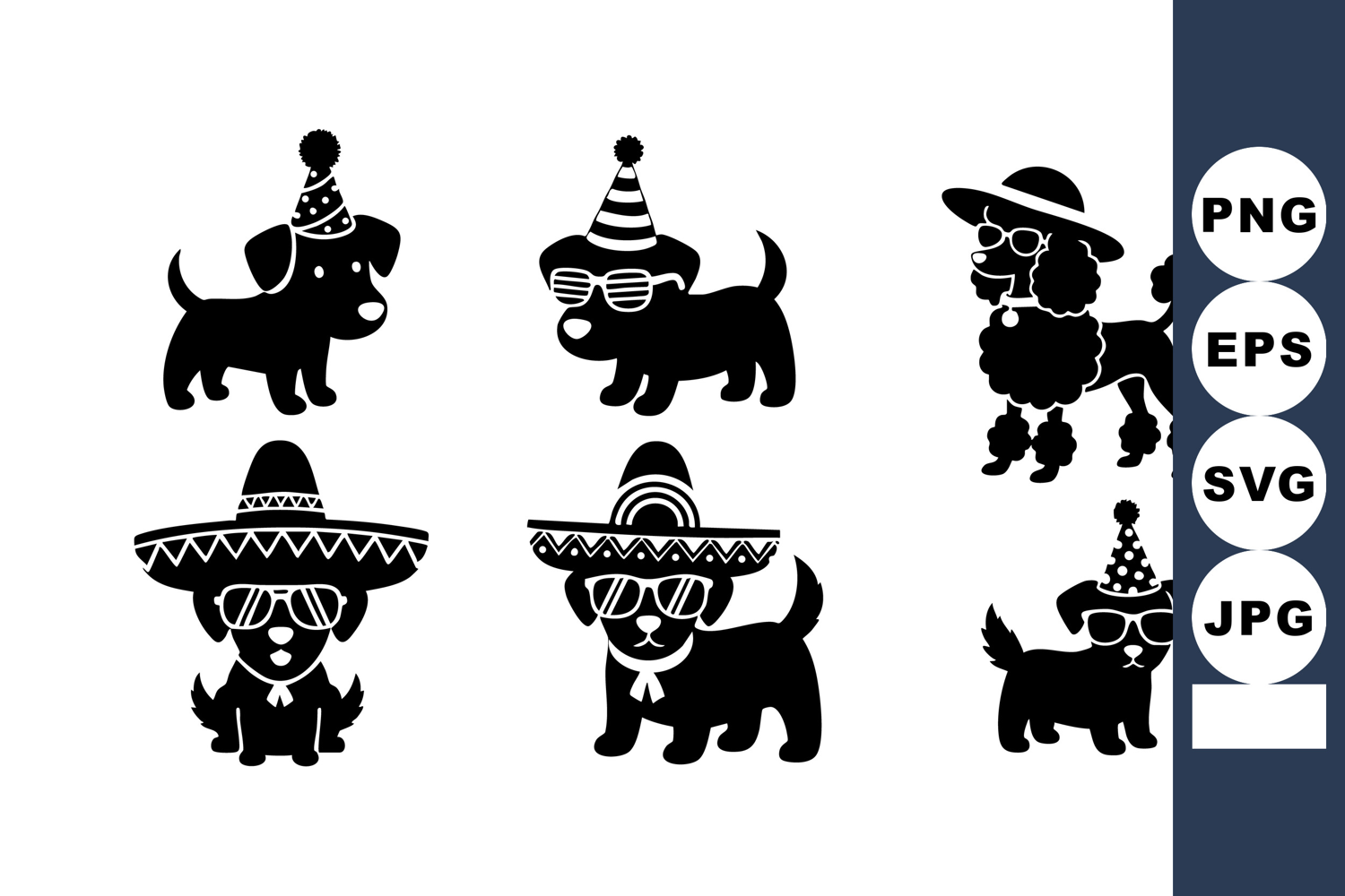 Festive Dog Illustration Dogs With Sunglasses Black Dogs Party Dogs Wearing Hats Dogs Wearing Glasses Dogs Wearing Sombreros Cute Black Dogs Party Hats Dogs Playful Dog Vector Cheerful Dog Drawing
