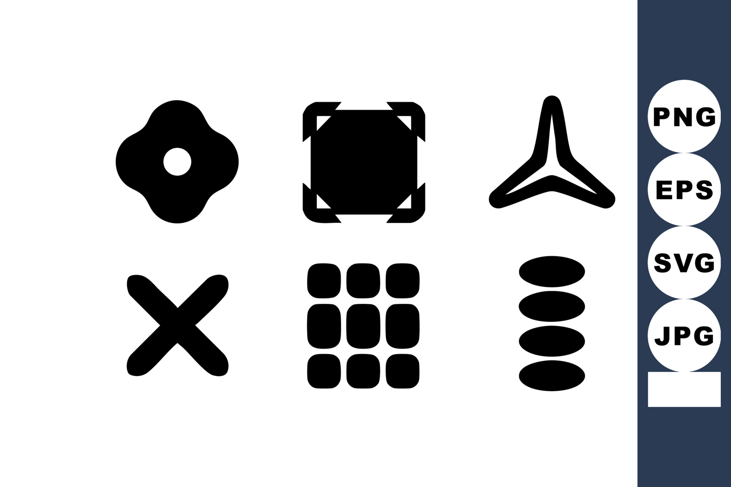 This vector illustration shows six black simple geometric shape icons including flower square triangle cross grid and stacked dots in minimalistic style. Clean modern design mood.
