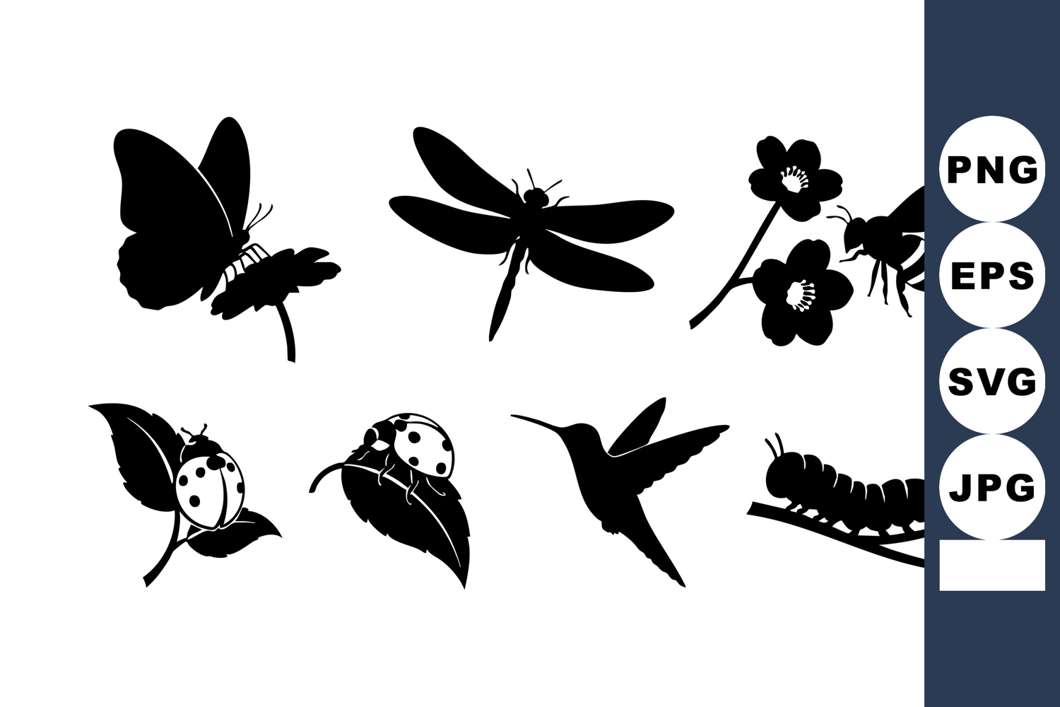 Flower Vector Illustration Natural Insect Shapes Insect Silhouette Vector Butterfly Dragonfly Bee Ladybug Hummingbird Caterpillar Black Insect Designs Garden Pollination Art Summer Flying Insects Delicate Winged Fauna Macro Insect Silhouettes