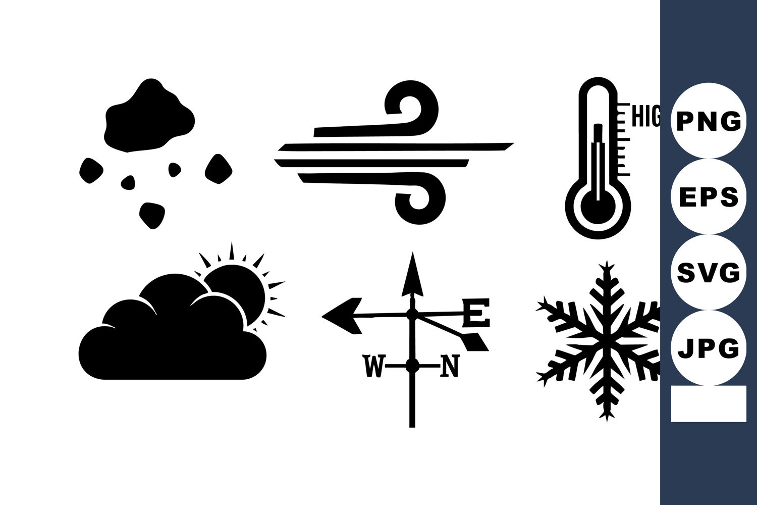 Black Silhouette Style Weather Icons Vector Snow Rain Wind Wind Thermometer Compass Cloud Sun Snowflake Cold Temperature Forecast Climate Season Direction Meteorology Sky Atmosphere Storm Precipitation Breeze Weather Forecast Meteorological