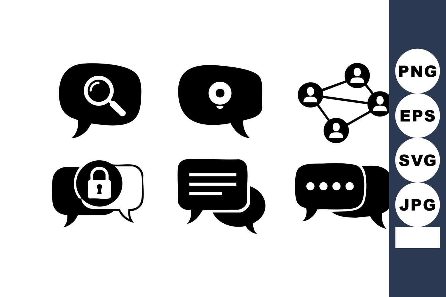 This vector shows six communication icons including speech bubbles with search, location, network, lock, text, and chat symbols in black and white. Simple and modern design. Clear and minimal style.