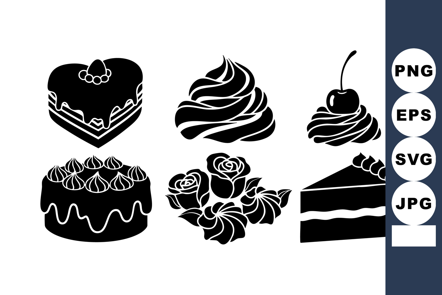 This vector illustration features black silhouette desserts including heart shaped cake, cupcake with cherry, decorated cake, frosting, roses, and slice of cake in a simple style. Elegant mood.