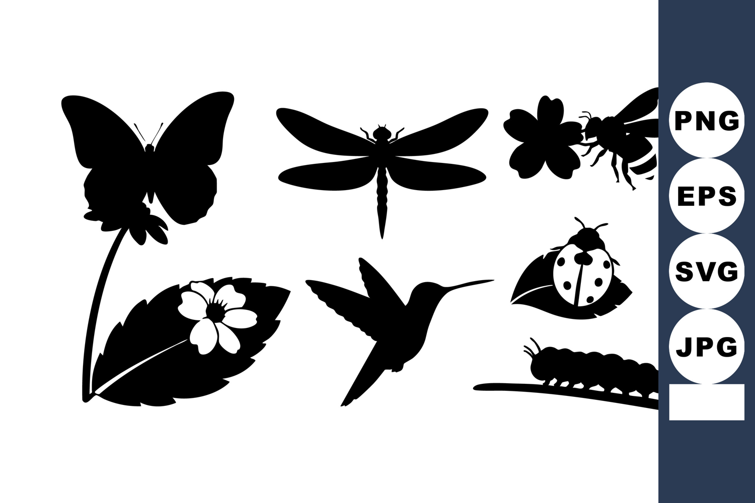This vector illustration features black silhouettes of various insects including butterfly, dragonfly, bee, ladybug, hummingbird, and caterpillar with flowers in a simple black and white style. Clean and minimal.