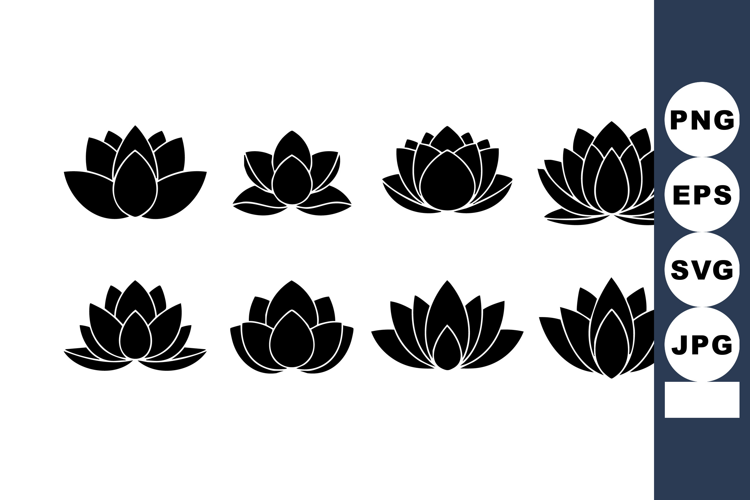 This vector file displays a collection of eight black lotus flower silhouettes with clean lines and simple shapes representing nature and floral beauty in a minimalist style peaceful.
