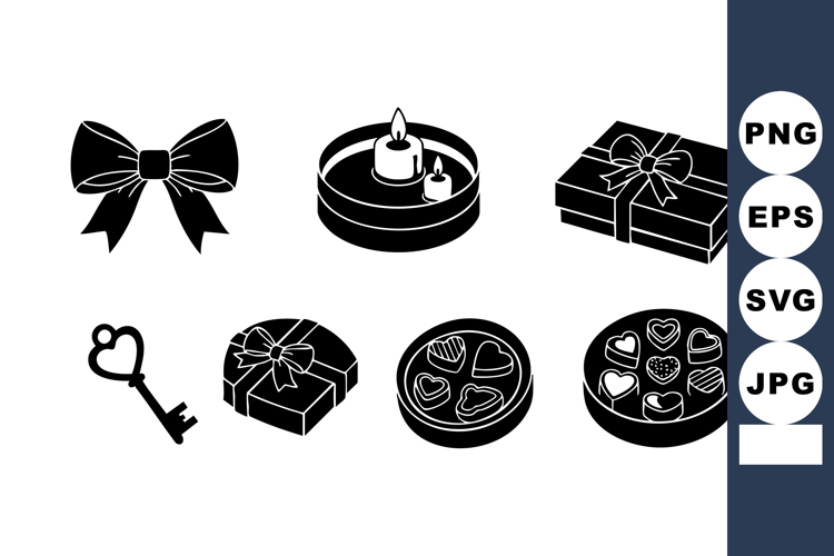 Black silhouette vector icons showing gift boxes with ribbons, heart shaped chocolates, a vintage key, a lit candle, and a decorative bow. Simple elegant festive mood.