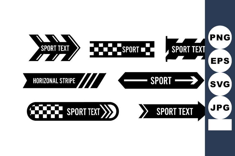 This vector illustration presents a set of black and white sport arrows and stripes with text elements in a horizontal layout. The style is clear and modern, dynamic mood.