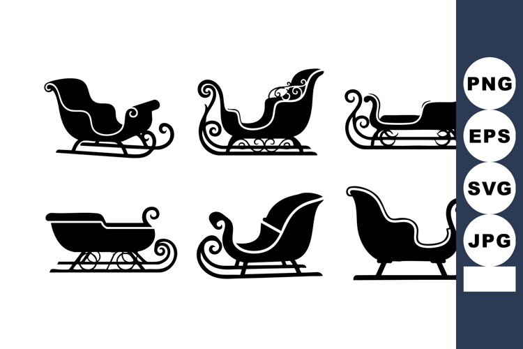 This vector file contains six vintage sleigh silhouettes in black and white featuring ornamental winter transport designs. The image presents classic sleigh styles with elegant curves and details. The overall mood is nostalgic.