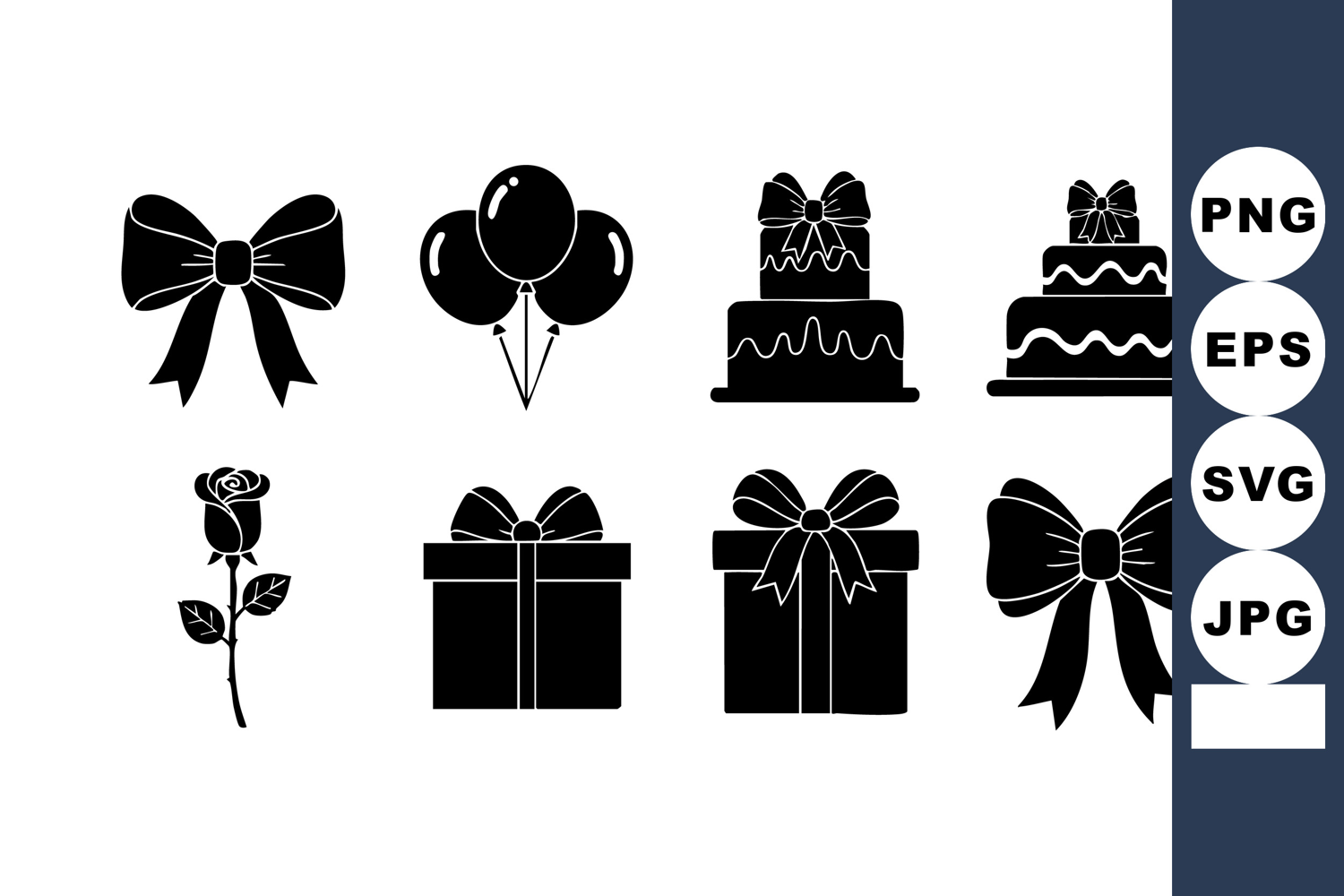 This vector illustration shows a set of celebration icons including bows balloons cakes rose and gifts in black silhouette style perfect for festive designs cheerful.