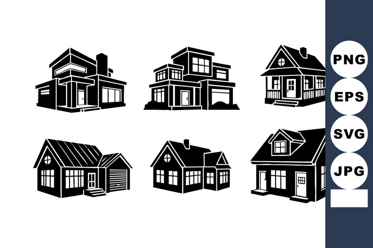 Black Silhouette Houses Vector House Illustration Different Roof Styles Various Architecture Styles Classic Mood Design Flat Design Houses Six House Silhouettes Modern Classic Homes Suburban Rural Houses Traditional Roof Shapes
