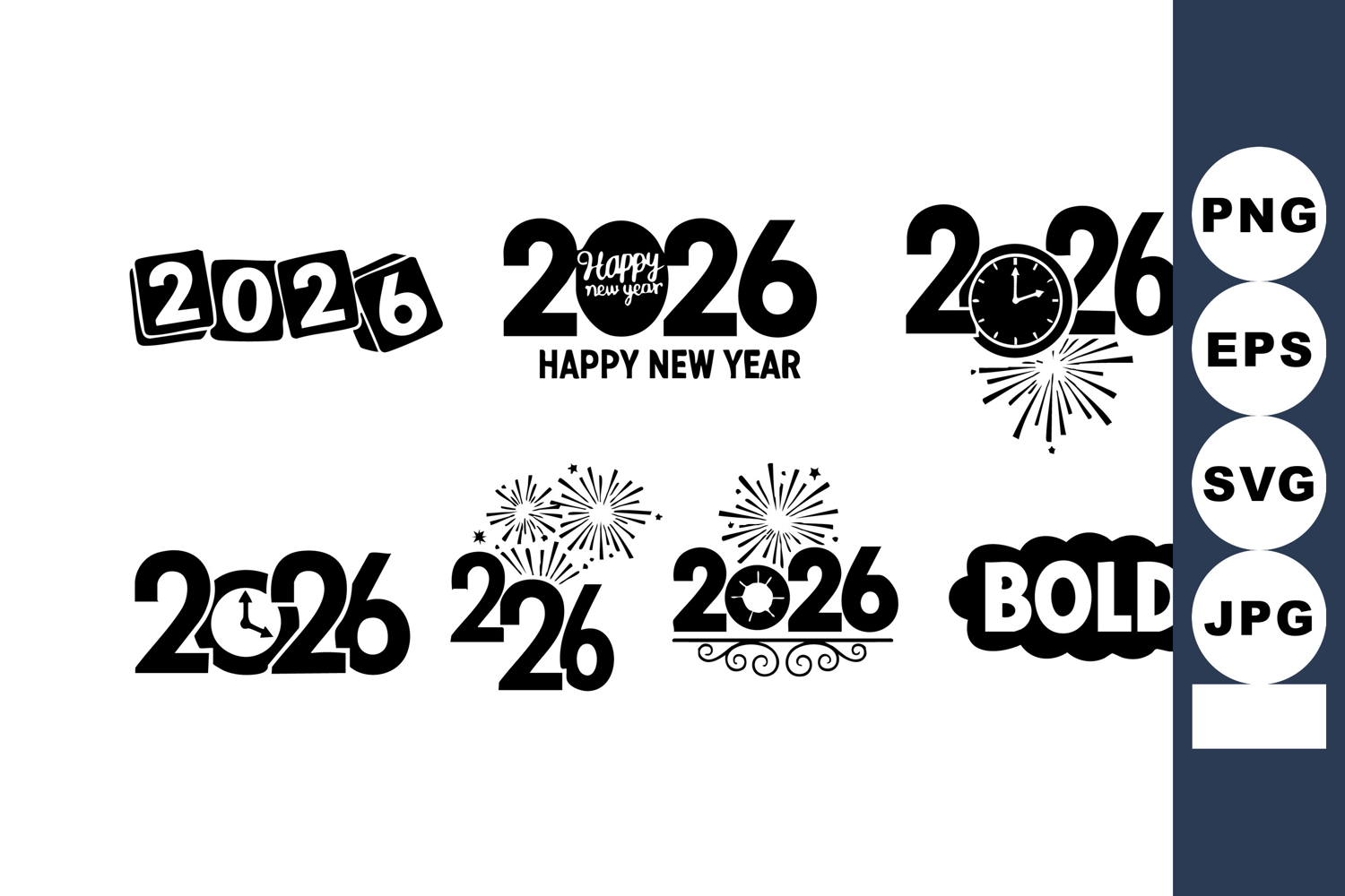 This vector image shows multiple designs of the year 2026 with countdown themes including clocks, fireworks, and bold text styles. The black and white illustration conveys excitement and festivity. Bright mood.