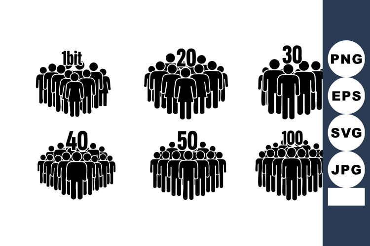 This vector illustration shows six groups of people in black silhouette representing different crowd sizes with numbers above them in a simple style calm